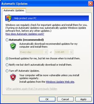 IntroductionMany customers are already familiar with "server environments", that is IT environments where computers need to be running 24 hours a day. This document will be the most valuable for non-IT professionals that are not normally managing Windows servers. The Tempurity System is comprised of two software components - at least one Tempurity Server which collects temperatures and other data from at least one monitored device 24 hours a day through the network, and at least one Tempurity Monitor that communicates with the Tempurity Server and sends alarm notifications. Both of these components must be running constantly in order for the Tempurity System to function properly. They can be running on the same, or different machines. Various events, such as manual restart, power failures, automatic windows updates, and sleep settings can interrupt the ability of your computers to perform needed Tempurity functions. While these temporary outages are common, and if these outages are short they will not seriously affect quality operation of the system, the computer must resume operation seamlessly after "interrupting" events. This can be easily achieved, even in non-server-room environments, however your computer must be configured properly and tested. This document describes the recommended Windows XP Operating System and BIOS configuration options that should be considered for computers running each component, Tempurity Server and Tempurity Monitor. Tempurity Server and Monitor Computer Operating System SettingsIn all versions of the Tempurity Server the system will resume temperature and other data collection automatically after a reboot if the computer is configured correctly as described below. Earlier versions of the Tempurity Monitor ran interactively and did not automatically restart. Later versions, Tempurity Monitor (version 1.6 and later) software automatically resumes the capability of sending alarm notifications after a reboot. Neither Monitor or Server need to be logged into a user account in order to run. Processing is accomplished in the background. The following settings are the most important and should be examined to help ensure that Tempurity Server and Tempurity Monitor computers are always running: Windows Power Settings BIOS Power Settings Windows Automatic Update Settings When Do I Need to Make these ChangesWhile these setting are important for Tempurity Servers, customers that are using Tempurity Monitors to view data only, and not for alarm notification sends, will not need to follow these steps. That is, alarm notification sends can stem from Monitors anywhere on the network. If this function is covered by a PC somewhere else on the network it need not be established permanently on every computer running the Monitor. Windows Power Option SettingsYou will need to adjust the Windows Control Panel Power Options such that the computer starts automatically whenever an interruption such as a power failure occurs. Click Control Panel and then on Power Options. Set the power options on your Tempurity Server as follows: This "Power Always On" setting is required for Tempurity Servers and for Tempurity Monitors. BIOS Power SettingsSome Windows computers must be set to automatically reboot when the power is restored after a power failure. This is accomplished using the PC's BIOS. Most computers have BIOS settings that will allow you to reboot automatically after a power restore however the commands to enter the BIOS are different among types of computers. Check your owners manual or check online for the procedures needed to configure this option on your specific computer. Testing for Correct Resumption of Operation after a Power FailureAfter the above have been set, try simply unplugging the power cable from your PC. Then plug it back in. If the PC reboots and the Tempurity Server or Tempurity Monitor have started as expected, your PC is configured correctly. The PC need not be logged into an account for the Tempurity Software to be running. As long as the computer is powered on, Tempurity Software is running in the background. If the power is restored and the computer does not reboot, check the BIOS and Windows settings as indicated above and try again. To verify Tempurity Server function, use a Tempurity Monitor from another computer and verify that the data is being collected. You'll need to wait several minutes for data to be acquired. To verify Tempurity Monitor function, disconnect one of the NTMS units from the network, and verify that alarm notifications are received as expected. You will need to wait for a period longer than the communication alarm threshold for this device, and have an active alarm group that is watching this monitored device. Alarm Notifications are Sent for Active Alarms when the Tempurity Monitor RestartsWhen the Tempurity Monitor is restarted for any reason, alarm notifications are sent for any alarms that are outstanding at the time of the restart. This is true whether or not these notifications were sent previously. This is because the Monitor can't tell if those alarms were generated during the period when it was not active. This is a way for the Tempurity Monitor to "err on the side of safety" by sometimes sending alarm notifications more than once. Windows Automatic Update SettingsWindows can be set to automatically update the operating system whenever new software is released by Microsoft. When an update is obtained, depending on your automatic update settings, the computer may be rebooted. This reboot can cause a temporary pause in the ability to of a Tempurity Server to collect temperatures (usually a minute or less). More significantly a reboot may expose conditions that may pause the automatic resumption of processing by the operating system. Networked Robotics recommends that the Windows Automatics Update option for computers running Tempurity System components should be “Download updates for me, but let me choose when to install 