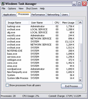 Windows Process List You can also use the Windows Task Manager process list to confirm that the Tempurity Server process, called NewTempurity.exe, is running as expected. Older Monitor VersionsThe Tempurity Monitor must be running in order for alarm notifications to be received. In versions 1.6 and later, the monitor is always running if the computer is on. Previous to 1.6 the monitor computer must be set to running the monitor with the autostart utility. The screenshots below show how login can be automatically enabled to automatically run earlier versions of the Tempurity Monitor.