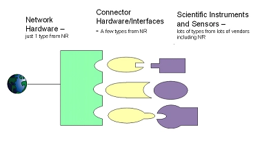 Networked Robotics' Technical Approach to Temperature MonitoringThe Networked Robotics approach to temperature monitoring is different from that of our competitors. Where competitors often use a single type of networked sensor, we collect data from many different environmental and electronic sources in many different ways. We believe that the method of connectivity to the instrument is more important than the network technology used to relay the acquired values to data collection servers. With Networked Robotics' architecture you can use whatever method of standard network connectivity, wired or wireless, that you want. Where possible Networked Robotics uses no sensors, preferring to connect to those already in an instrument via data communication. 1) IntegrationThe Networked Robotics command to acquire temperature directly from a Thermo Fisher Scientific® incubator is "T". You can acquire temperature directly from a Chart Biomedical® MVE liquid nitrogen cryofreezer using the network-side command "T". You can acquire temperature directly from an older Harris® -80°C freezer using the command "T". You acquire temperature from a Networked Robotics digital temperature probe using the command "T" and on and on. The Networked Robotics hardware knows how to talk the complicated languages of each device type and convert that to a simple language on the network side. Networked Robotics integrates network data collection by providing a common language for diverse instruments from multiple vendors. The list of instruments we talk to grows constantly. The figure shows how this is accomplished in terms of the physical connections. Yellow and green are our hardware and purple represents scientific instruments and sensors from both Networked Robotics and third parties.
